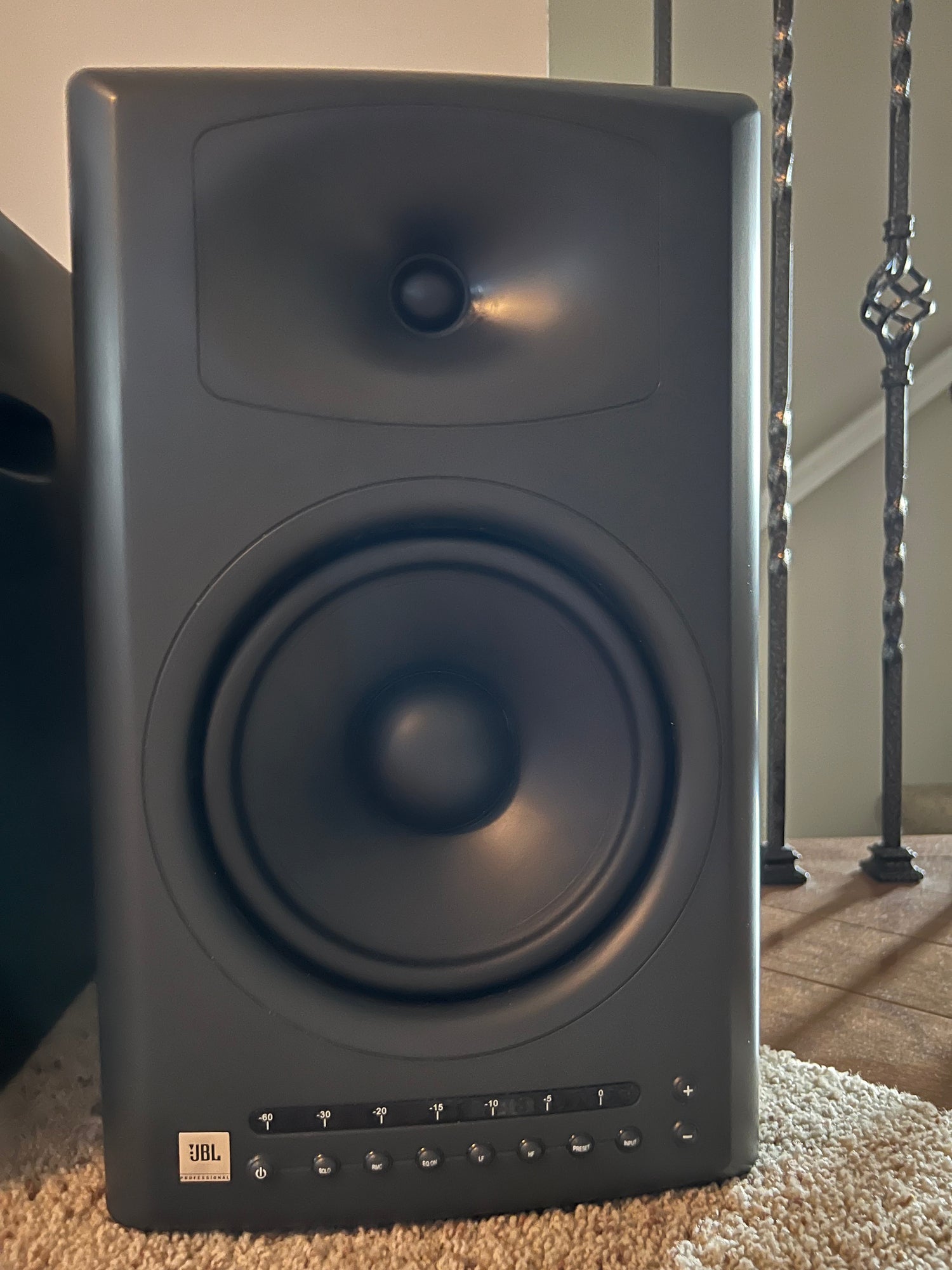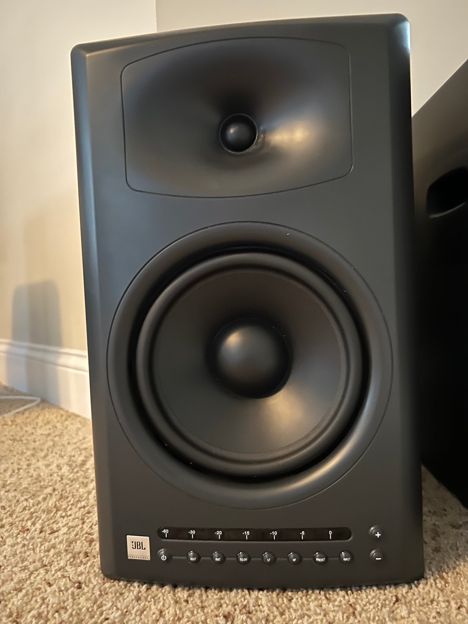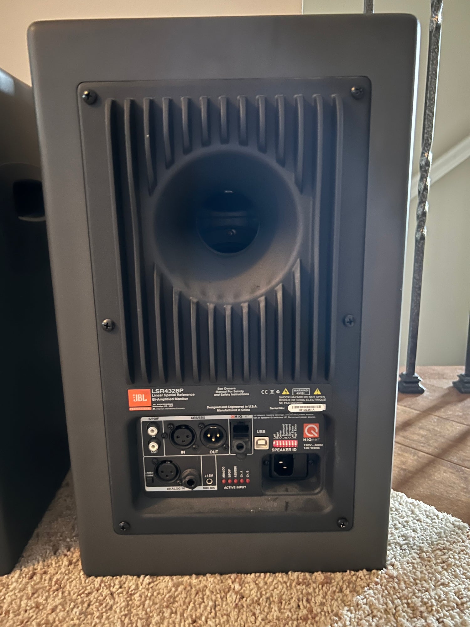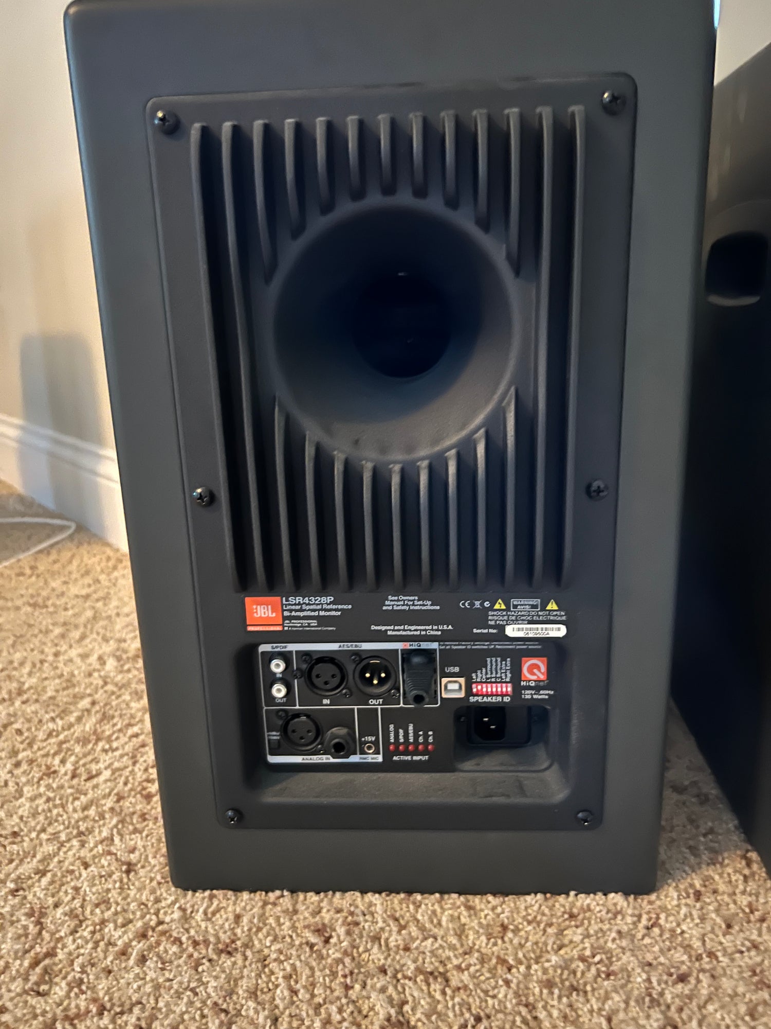 Pair of JBL LSR 4328 P Studio Monitors in excellent condition. However, this model had a manufacturing defect that all of them share, the face of the speaker is made of a polymer that gets sticky if not regularly cleaned. I keep them clean, they look brand new!!